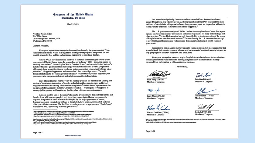 Signed on May 25, the letter said, “We request urgent action to stop the human rights abuses by the government of Prime Minister Sheikh Hasina of Bangladesh, and to give the people of Bangladesh the best possible chance for free and fair parliamentary elections to be scheduled this fall.”