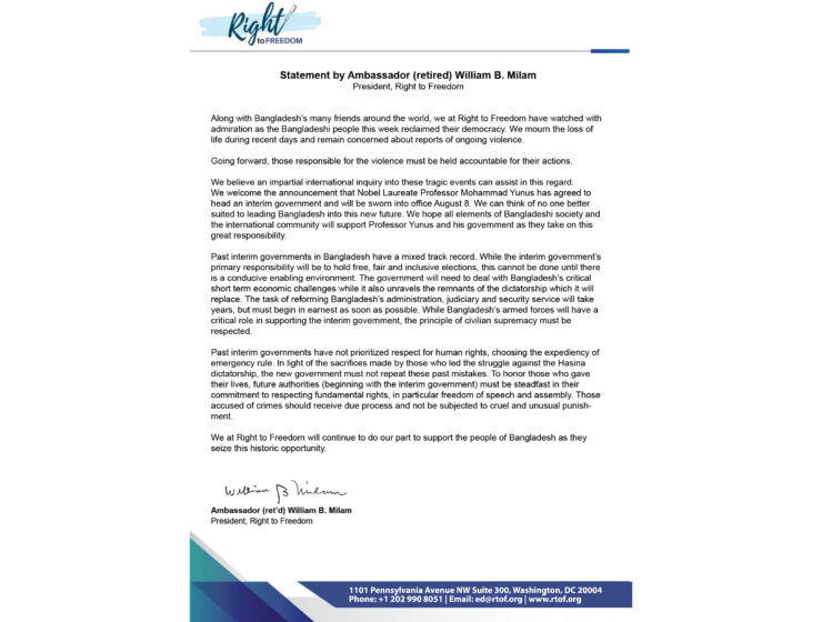 Statement by Ambassador (retired) William B. Milam President, Right to Freedom Along with…