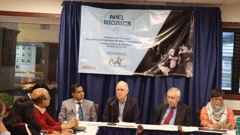 The human rights organization, Right to Freedom (R2F) in association with South Asia Perspectives organized a panel discussion on December 05 at the National Press Club titled “Dissent Criminalized: The State of Free Speech in Bangladesh”. Participants included internationally renowned writer and photojournalist and Time Magazine Person of the Year 2018 Dr. Shahidul Alam and the Committee to Protect Journalists’ Program Consultant Dr. Steven Butler. The discussion was moderated by R2F President Ambassador (ret) William B. Milam. Representatives from the U.S. State Department, international organizations, Washington-based journalists, scholars and R2F board members were also present as participants. The Executive Director of R2F, Mushfiqul Fazal (Ansarey) gave opening remarks. The discussion centered on the current state of freedom of speech in Bangladesh and the challenges faced by journalists and activists in exercising their rights to freedom of expression.Key speaker Dr. Shahidul Alam thanked the hosts for organizing an event where he was able to speak about the human rights issues facing Bangladesh. He highlighted R2F Executive Director Mushfiqul Fazal for his tireless work in this area. Dr Alam pointed out that the Bangladesh Government had recently filed a case against Mr. Fazal under the Digital Security Act (DSA).