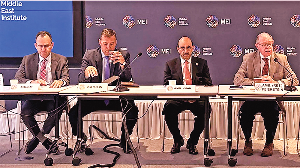 Ambassador Khan thanked MEI President Paul Salem and Vice President of Policy Brian Katulis on Twitter for assembling such a distinguished group of experts, diplomats, and opinion leaders for the event. In addition, he thanked Ambassador Gerald Feierstein (ret.) for moderating the session with exceptional skill and etiquette.